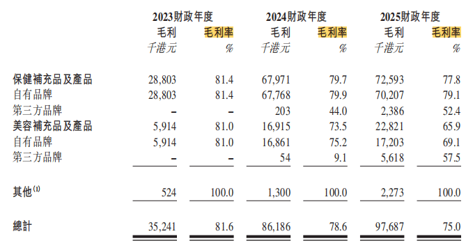 数据显示,2025财年,正品控股销售的第三方品牌的保健品和美容品毛利率分别为52.4%和57.5%,而自有品牌毛利率则分别为79.1%和69.1%。
