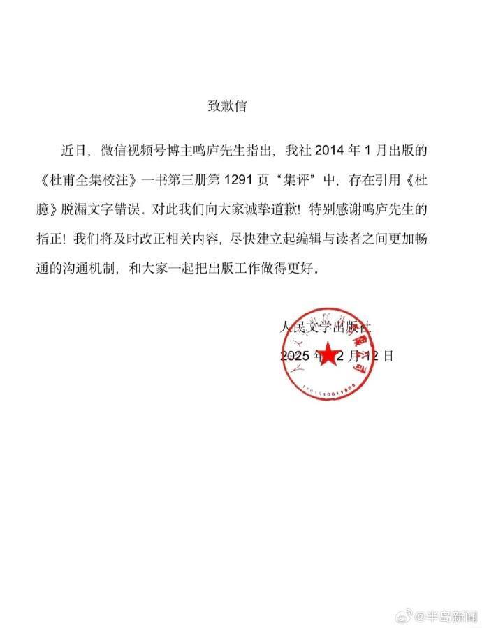 无独有偶,人民文学出版社不久前也因《杜甫全集校注》的文字脱漏而发布致歉信。两大文化出版巨头接连“翻车”,暴露的不仅是个别书籍的编校问题,更折射出行业质量把关的松懈。当最受读者信赖的权威出版机构,频频在最基本的编校质量上底线“失守”,难免让现在还在阅读和支持实体书的读者感到失望和困惑。