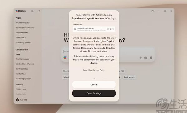 在微软的介绍中,Windows 11成为Agentic OS的第一步是让“让手指休息一下”,为此他们推出了语音唤醒指令“Hey Copilot”。使得用户无需再依赖传统的键盘和鼠标进行手动操作,只用喊出“Hey Copilot”,即可唤醒Windows系统中的Copilot应用,并用语音召唤Copilot来完成分析屏幕内容、回答问题、提供建议等操作。